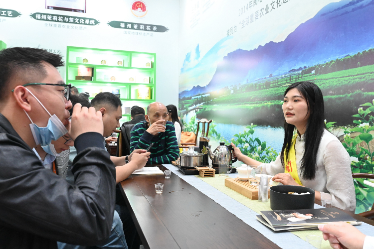 一家茉莉花茶企业工作人员(右)在向客人介绍福州的茉莉花茶。(图片来源:新华社)