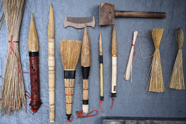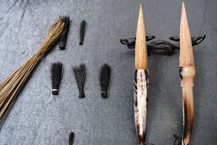 白沙茅龙笔成品、制作原料及部分制作工具。