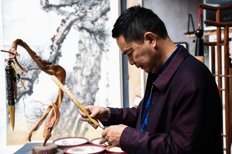 张瑞亨对白沙茅龙笔进行削锋。