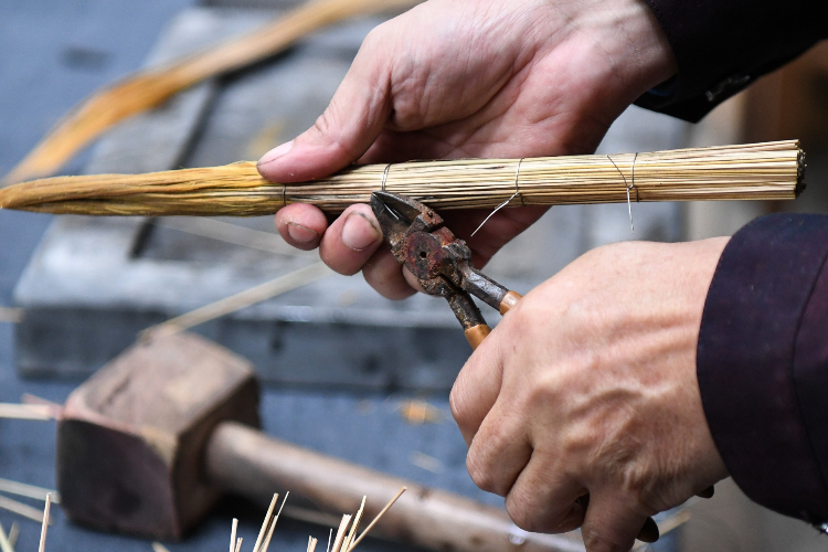 3月24日,在中国广东江门市新会区的冈州画院,白沙茅龙笔制作技艺国家级非遗传承人张瑞亨对制作白沙茅龙笔的原料茅草进行锤砸。(图片来源:本文图片均自新华社)