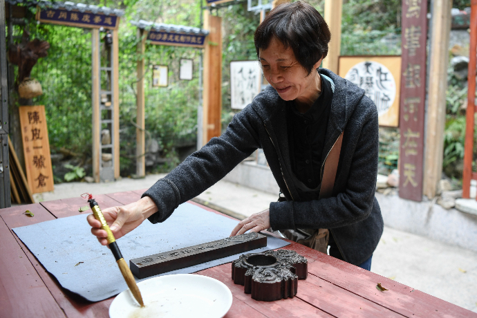 在白沙茅龙笔传承体验馆,游客用茅龙笔蘸水体验书法乐趣。