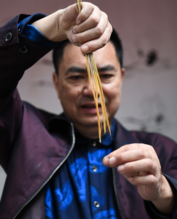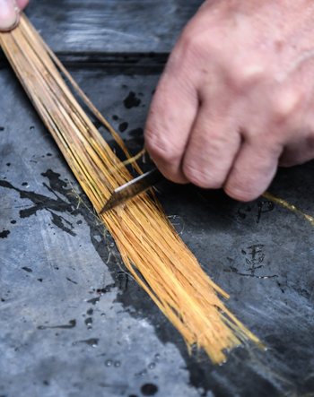 张瑞亨对制作白沙茅龙笔的原料茅草进行刮锋。