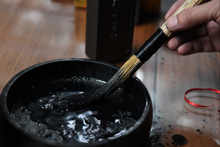 张瑞亨用白沙茅龙笔蘸墨汁。