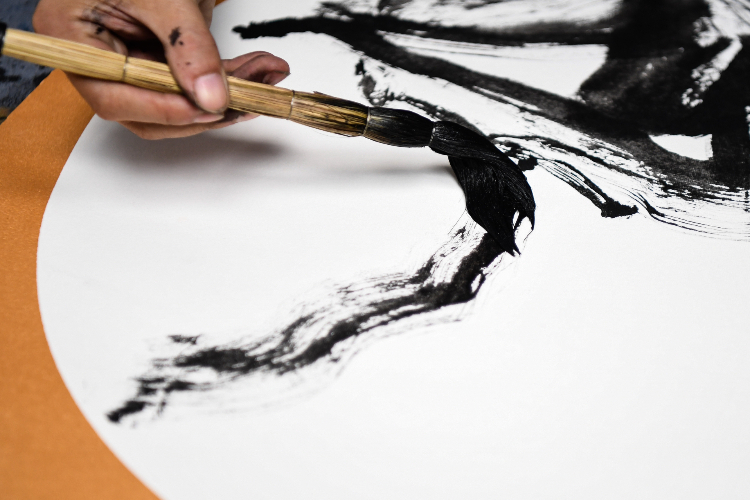 张瑞亨用白沙茅龙笔进行绘画创作。