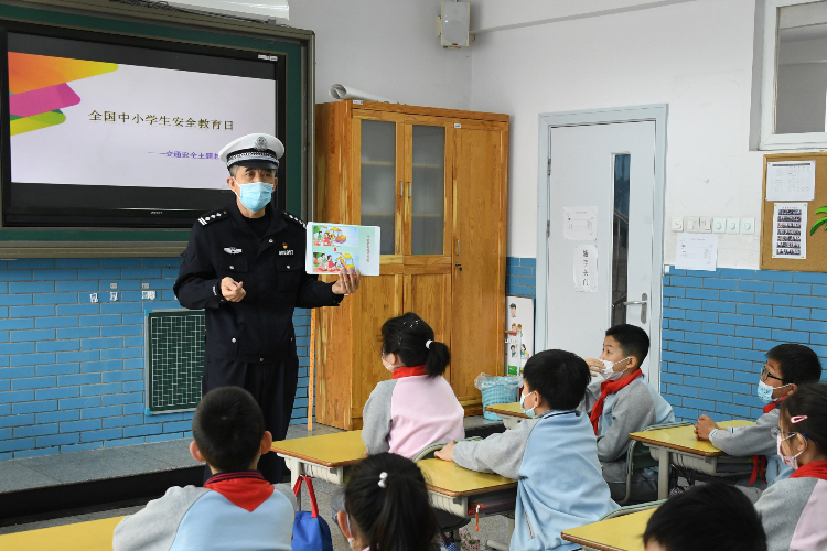 在北京市海淀区中关村第三小学,北京市公安局公安交通管理局海淀交通支队的民警为学生讲解交通安全知识。(图片来源:新华社)