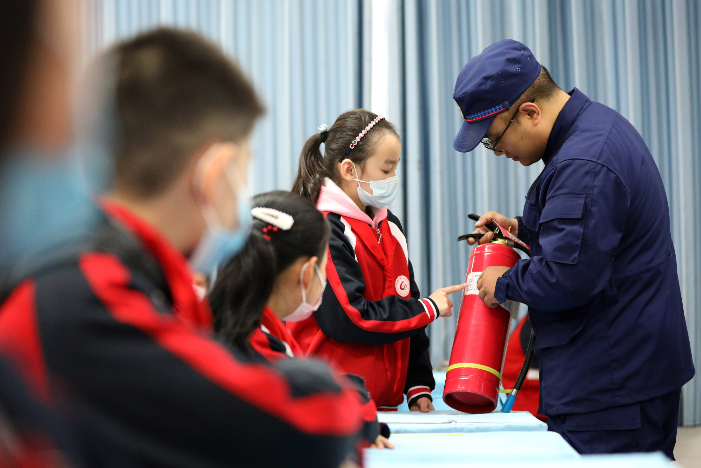 在河北省邢台市隆尧县第二实验小学,消防员为学生讲解消防安全设备使用知识。(图片来源:新华社)