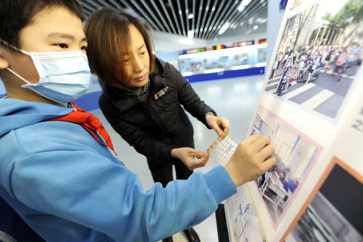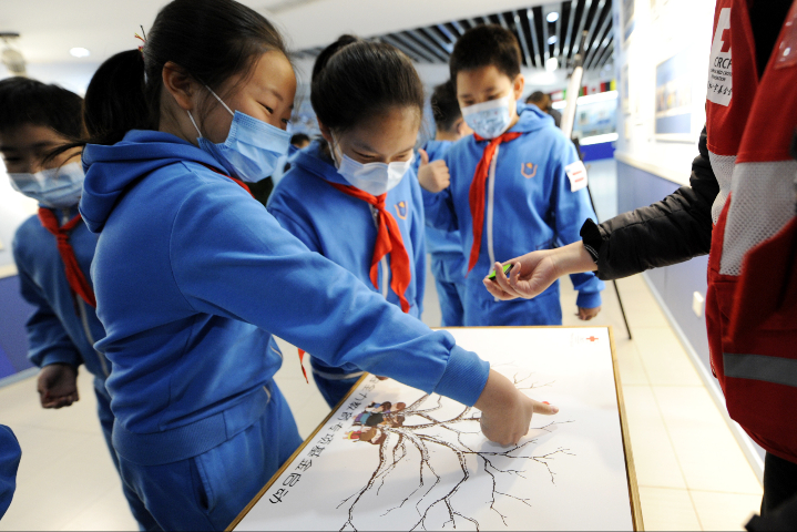 北京史家小学学生在中国红十字基金会工作人员的指导下观看安全教育展板。(图片来源:新华社)