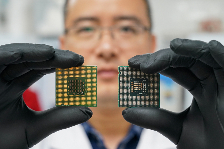3月30日,上海师范大学资源化学教育部重点实验室的卞振锋教授在展示经过“光催化贵金属溶解”技术处理前后的电子设备废弃物,右为处理后的电子设备废弃物。(图片来源:本文图片均自新华社)