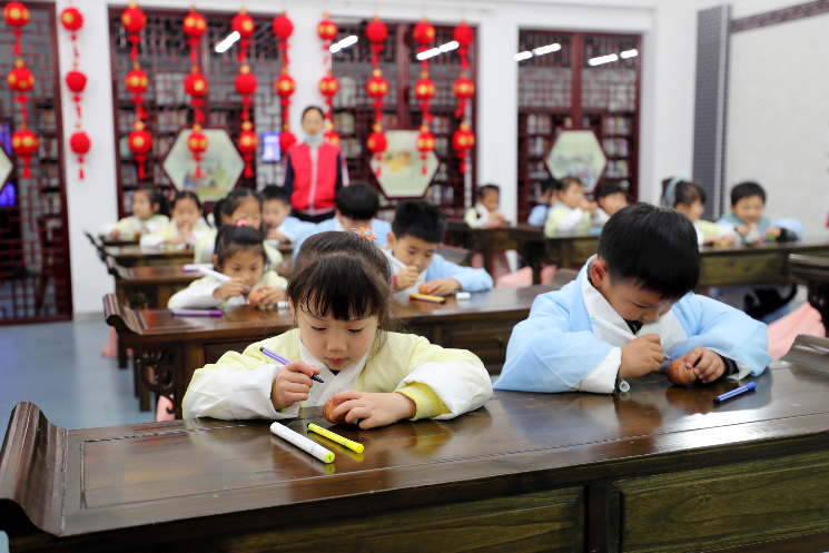 3月31日,小朋友在国学大讲堂上画彩蛋。(图片来源:本文图片均自新华社)
