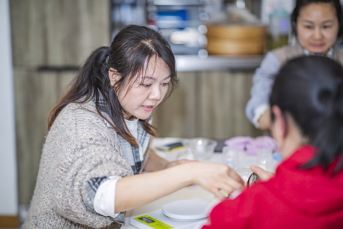 3月26日,在重庆市渝北区,欧阳勤芸在工作室向学员讲解做造型馒头需要的面团大小。