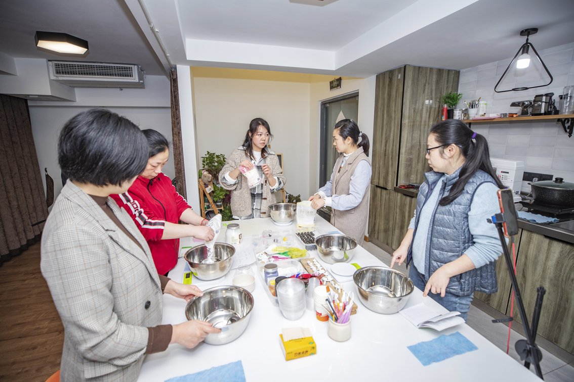 3月26日,在重庆市渝北区,欧阳勤芸(中)在自己的工作室内教授学员们如何制作花式馒头。