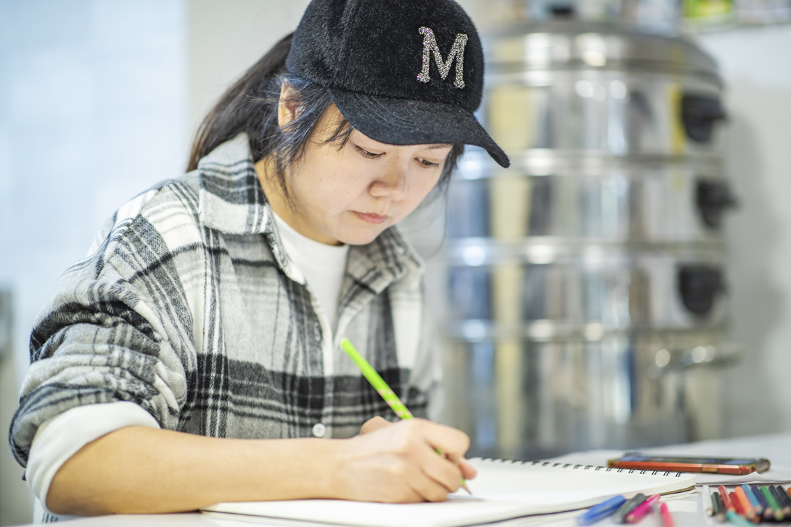 4月13日,欧阳勤芸在位于重庆市渝北区的工作室内为构思创作的造型馒头画设计草图。