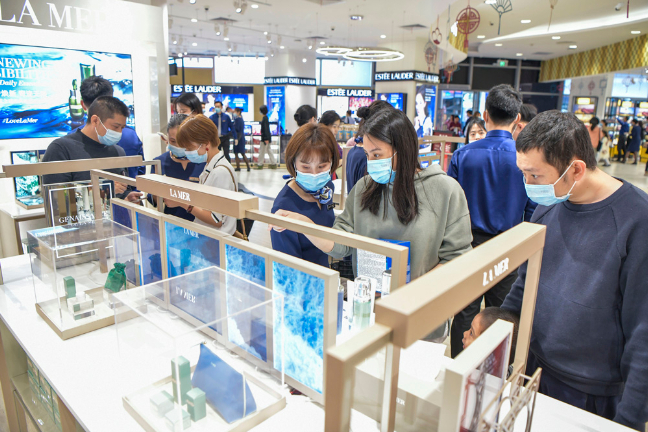 顾客在海控全球精品(海口)免税城选购化妆品。(图片来源:中新社)