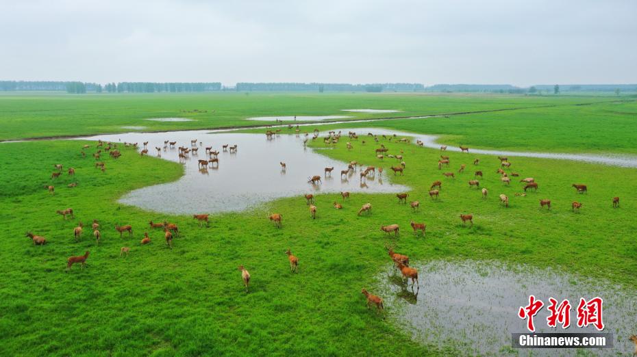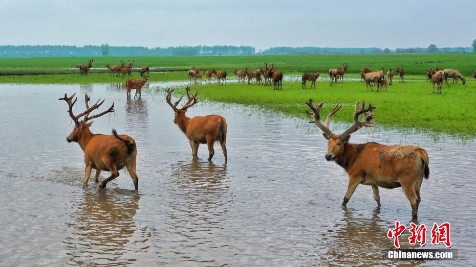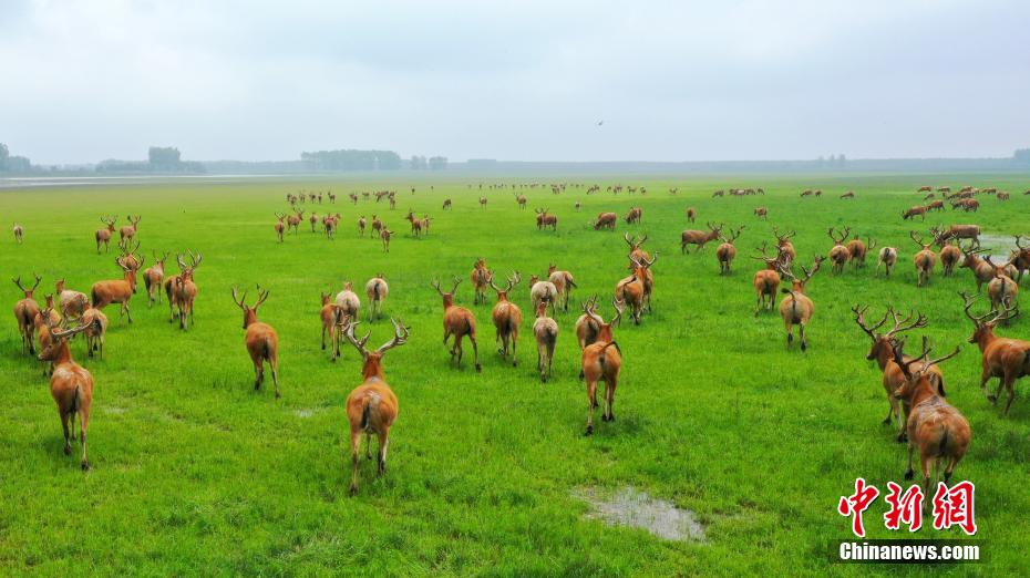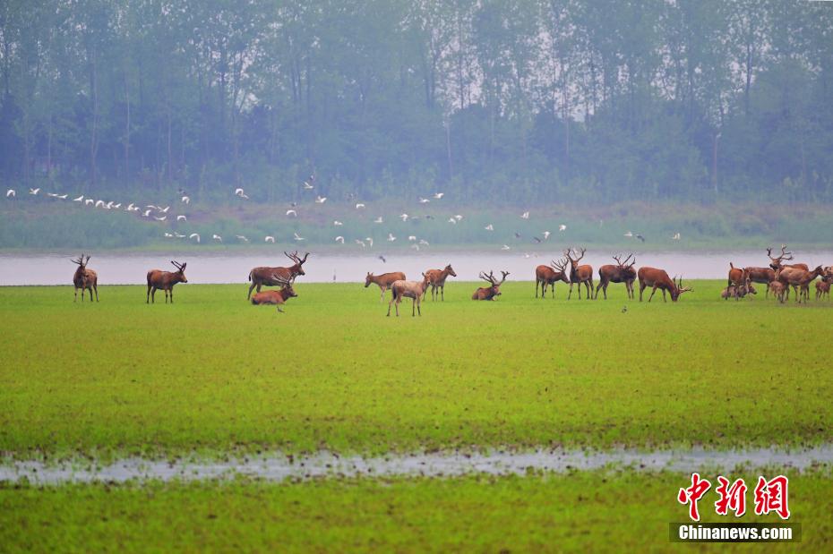 湖北石首:成群麋鹿在草地上栖息觅食