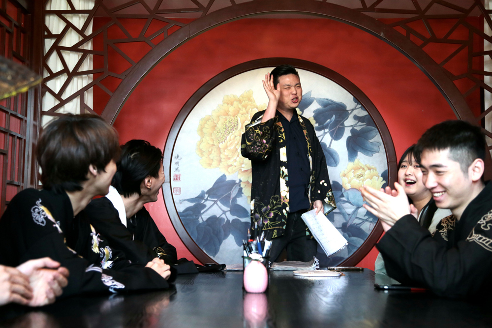 3月22日,在陕西省西安市一处“剧本杀”门店内,剧本“主持人”刘明浩在向玩家讲解剧情。(图片来源:中新社)