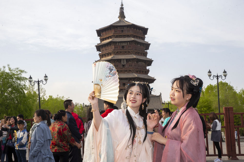 5月2日,山西省朔州市,汉服爱好者在千年应县木塔下进行快闪走秀。 (图片来源:中新社)