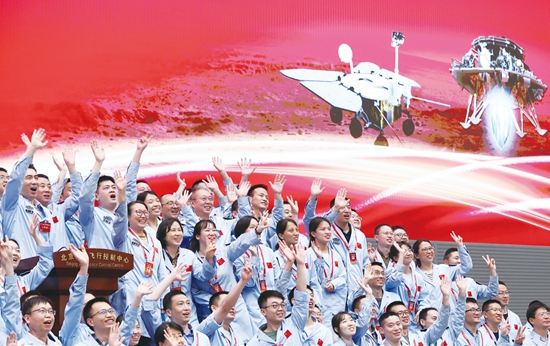 5月15日,航天科研人员在北京航天飞行控制中心指挥大厅庆祝中国首次火星探测任务着陆火星成功。根据“祝融号”火星车发回遥测信号确认,天问一号着陆巡视器成功着陆于火星乌托邦平原南部预选着陆区,中国首次火星探测任务着陆火星成功。(图片来源:新华社)