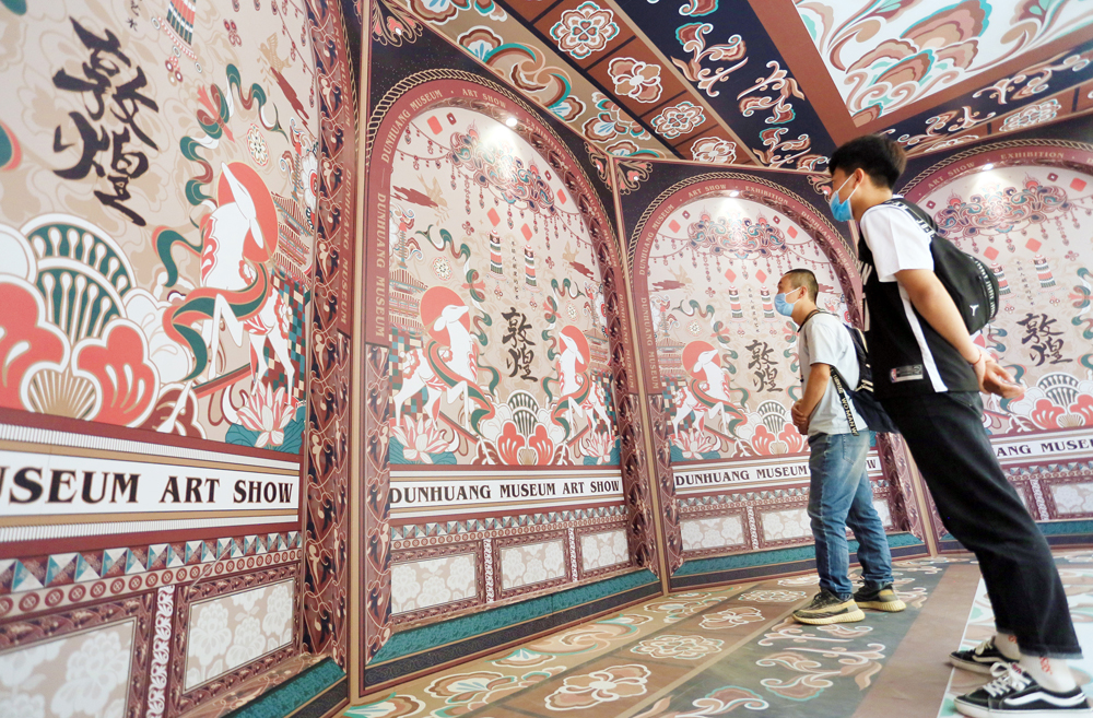 5月12日,甘肃兰州城关区万达广场内,市民参观敦煌博物馆馆藏文物及画作复刻品,近距离感受敦煌文化。(图片来源:中新社)