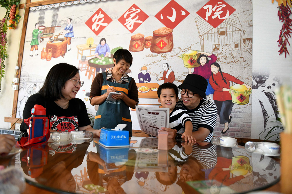 图为游客在河北石家庄市平山县岗南镇李家庄村一户农家乐里点菜。(图片来源:新华社)