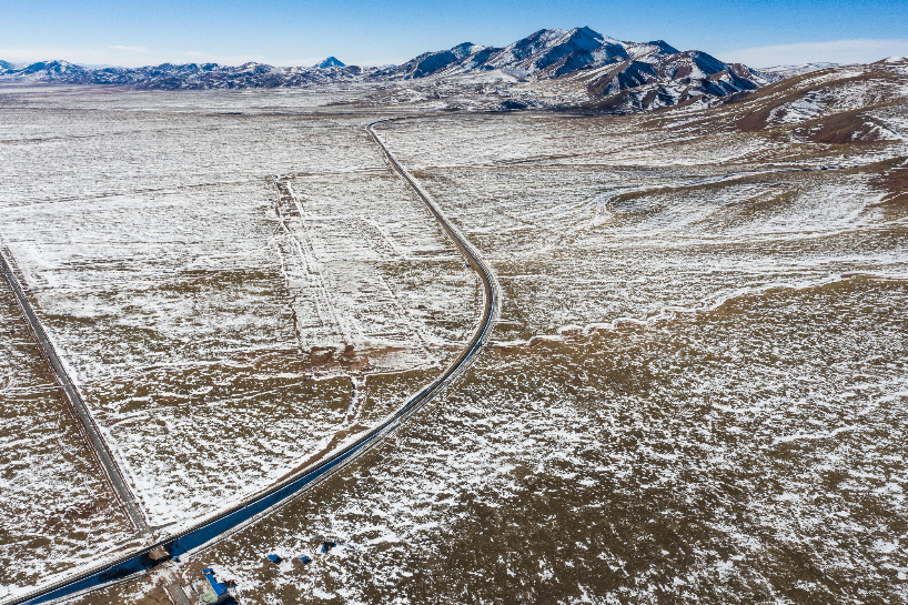 航拍青藏铁路那曲安多段。(图片来源:中新社)