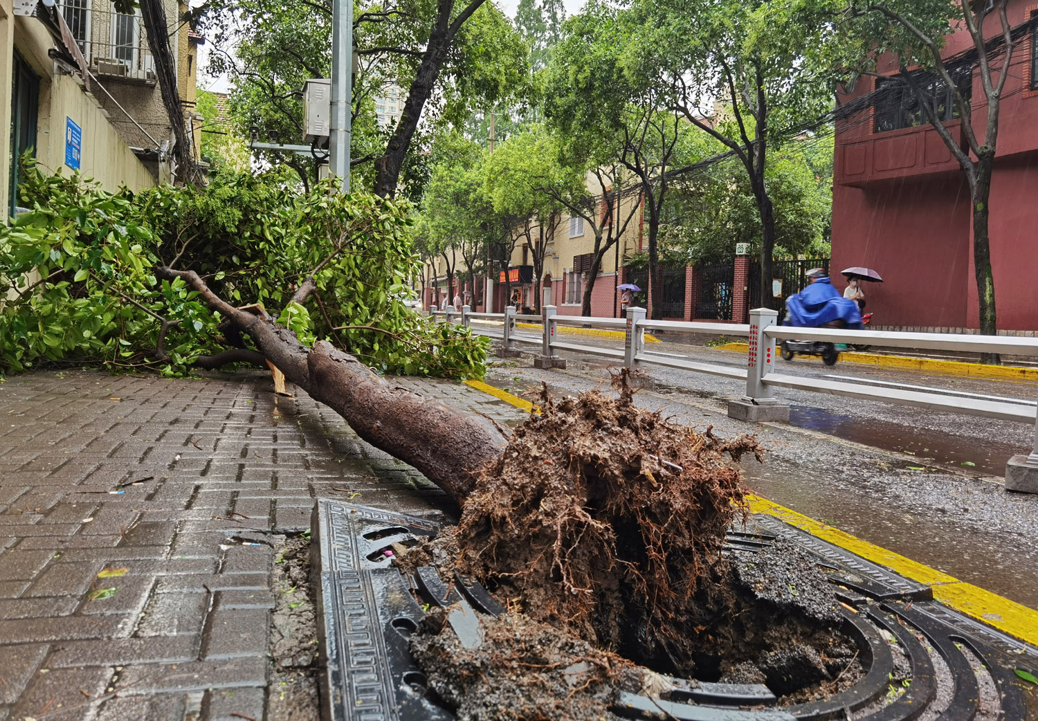 7月26日,受台风“烟花”的影响,上海街头的树木被连根拔起。当日上午,今年第6号台风“烟花”在浙江平湖到上海金山一带沿海再次登陆。(图片来源:本文图片均自中新社)