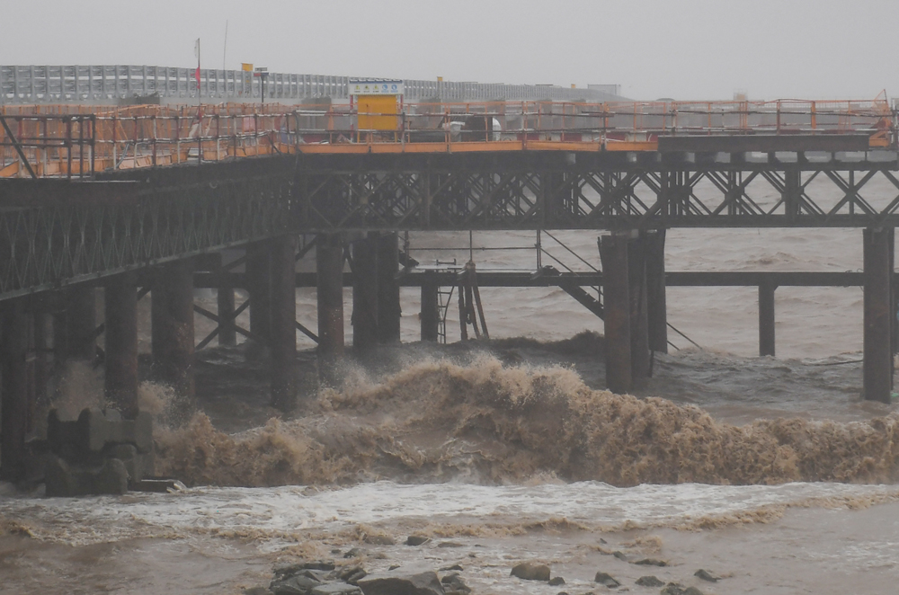 7月26日,浙江嘉兴,平湖一处海上平台附近海浪翻滚。