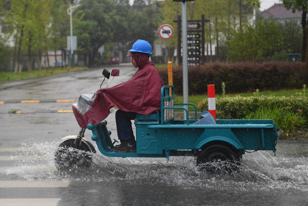 7月26日,浙江嘉兴,一名男子在积水中骑车出行。