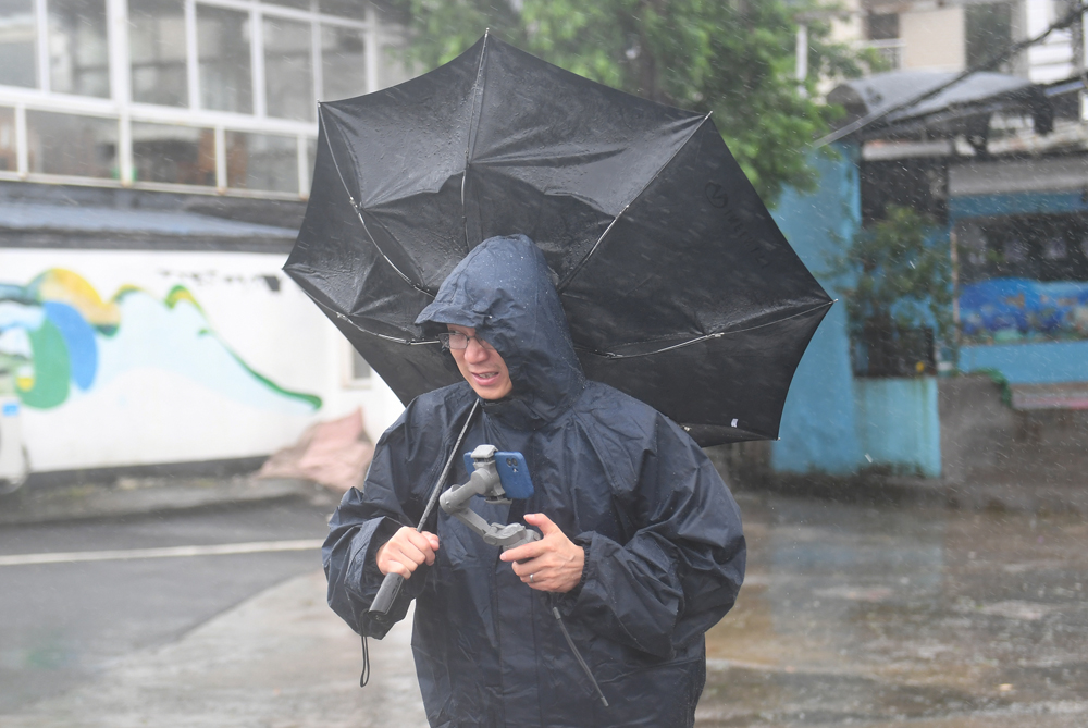 7月26日,浙江嘉兴,一名媒体记者的雨伞被吹翻。