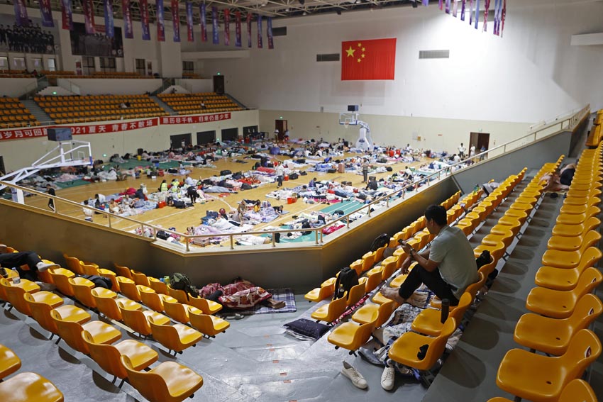 7月25日晚,在上海建桥学院的体育馆内,临港新片区工作的务工人员正在此休息。受台风“烟花”影响,上海市共转移撤离36.1万人,其中浦东新区因靠海的原因转移人口最多。