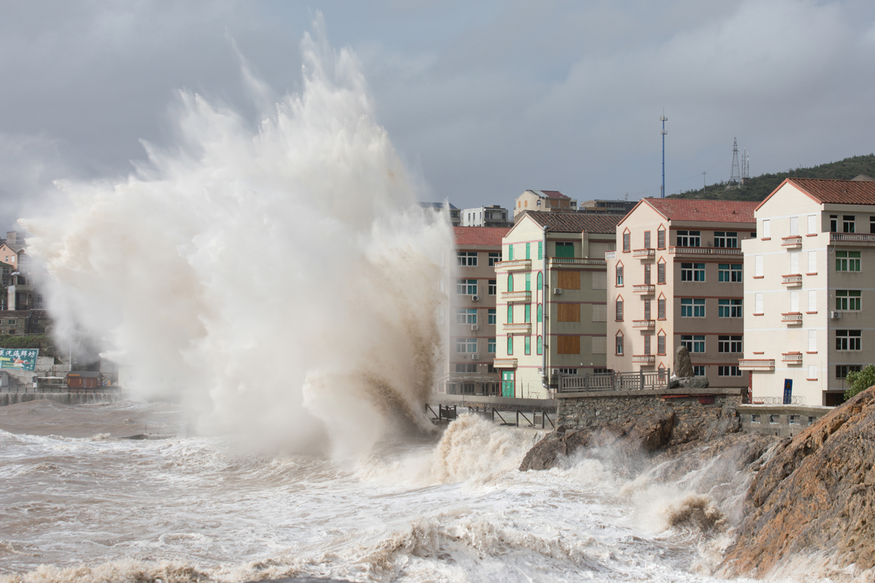 7月24日,浙江台州,石塘镇沿海出现数层楼高的海浪。