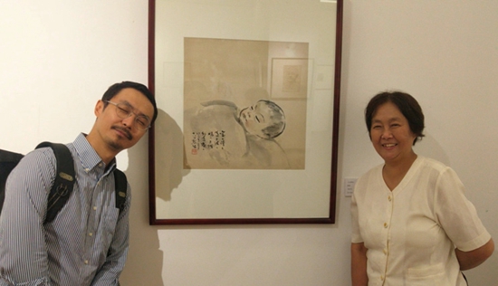 李琦教授外孙(左)和自己画像、妈妈李丹阳(右)合影。(图片来源:本文图片均由主办方提供)