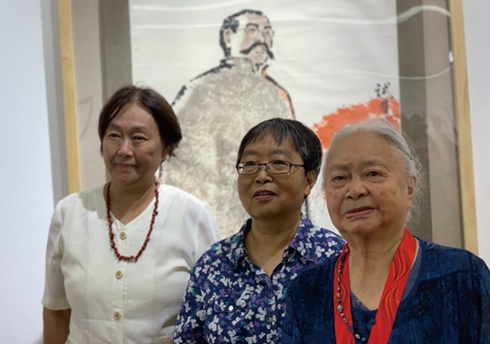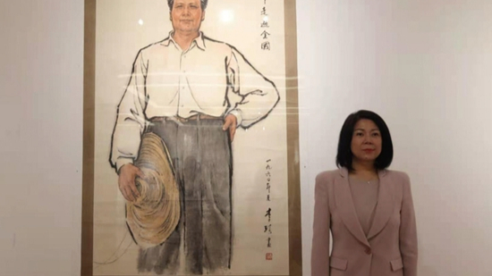 朱德元帅后人与《我们在一头》朱德画像合影。