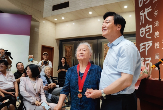 中央美院高洪书记为冯真教授发“光荣在党50年”纪念章。
