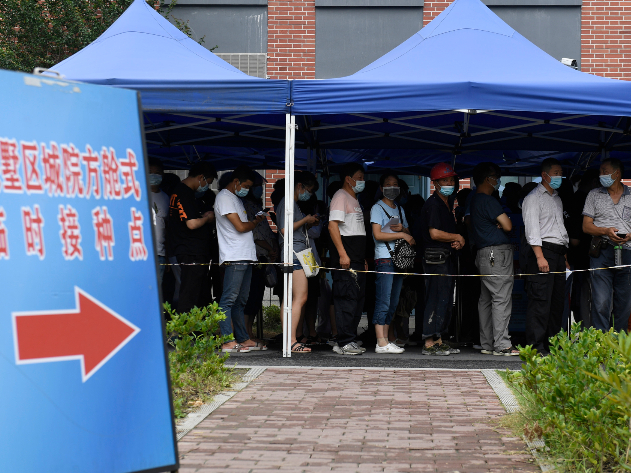 8月10日,浙江杭州,民众在一处方舱医院新冠疫苗接种点外排队等待接种。连日来,杭州市有序推进新冠病毒疫苗接种工作。(图片来源:本文图片均据中新社)