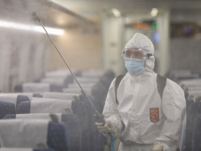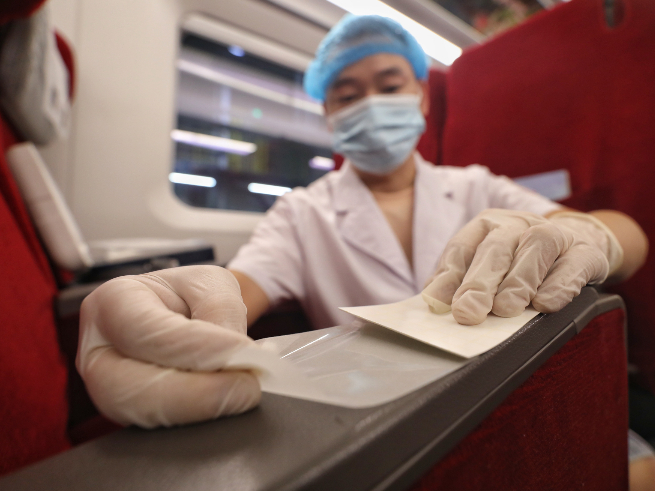 贵阳车辆段贵阳北动车运用所内,除机械师在检修作业外,中国铁路成都局集团有限公司贵阳疾病预防控制所的工作人员也对配属的动车组进行喷洒消毒,做好疫情防控、保障旅客出行安全。图为8月10日晚,疾控所工作人员在进行消毒效果检测。