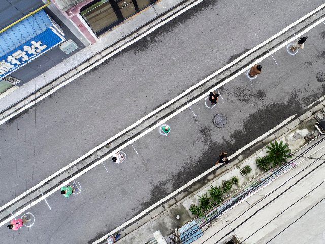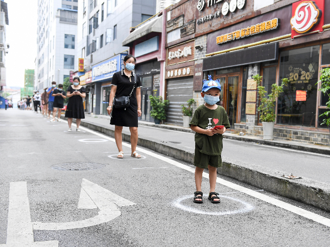 8月10日,湖南张家界开启第六轮核酸检测,为保持安全距离,当地官黎坪社区工作人员在地上画上了相隔约2.5米的“间隔圈”,让前来检测的居民保持间距排队。图为居民站在“间隔圈”内有序排队。