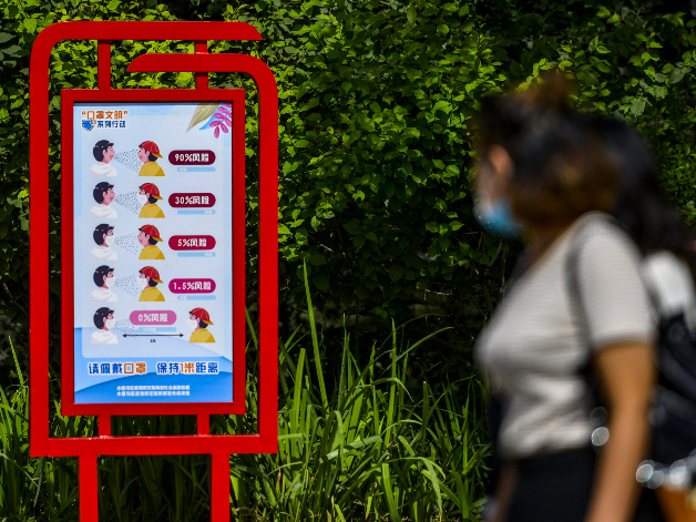 近日,根据乌鲁木齐市疫情防控工作要求,该市红山公园、水磨沟公园等旅游景区将日接待游客量调整为最大承载量的50%。图为8月10日,新疆乌鲁木齐市红山公园,游客从提示戴口罩的宣传栏前走过,该公园游客已明显减少。