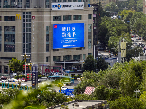 新疆乌鲁木齐市区一处大型电子屏幕上滚动播放预防新冠肺炎的相关内容,提示民众戴口罩、勤洗手、不扎堆、少聚集、非必要、不远行。