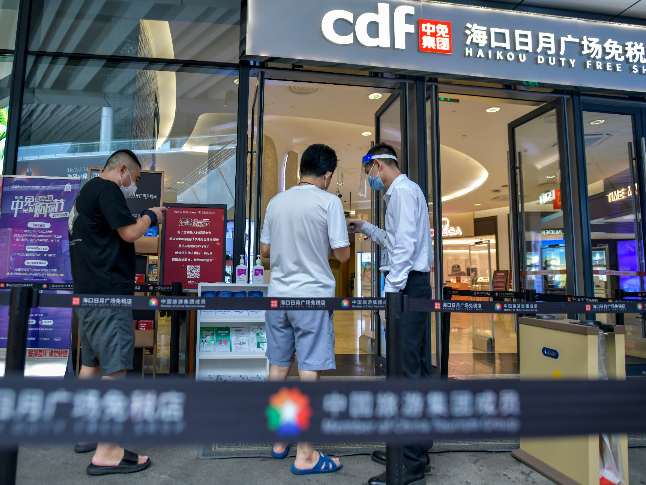 海口近日陆续出现新冠肺炎本土确诊病例,防疫形势严峻。当地多家离岛免税店正常对外营业,但疫情防控措施升级。图为8月10日,中免集团海口日月广场免税店入口,工作人员要求游客出示健康码、行程码进行核验。