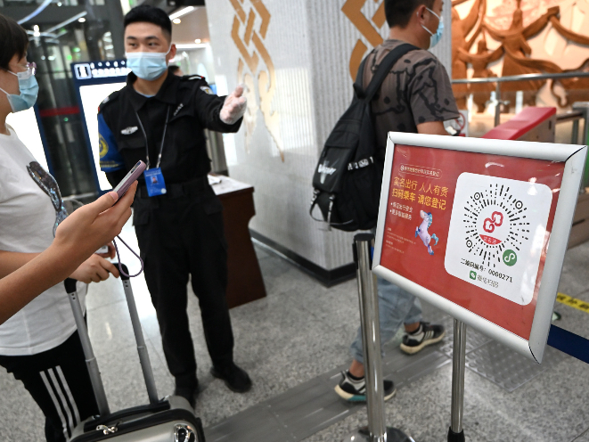 8月10日,工作人员引导乘客扫码登记后乘坐地铁。据悉,呼和浩特市地铁疫情防控不放松,进一步加强近期疫情防控措施,确保乘客出行安全。