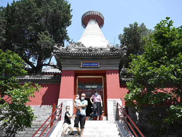 近日,受疫情影响,北京地区博物馆全面提升疫情防控措施,严格落实“限量”“预约”等举措,防止人员扎堆聚集。除此之外,北京市白塔寺管理处每日参观名额下调为1250人,展厅瞬时人流超过50人启动限流措施。图为8月10日,游客佩戴口罩在北京白塔寺参观。