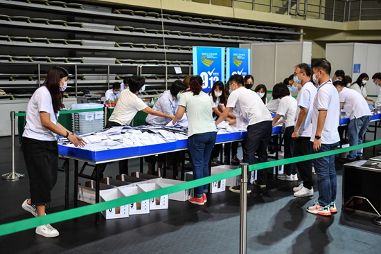 9月12日,澳门特区第七届立法会选举日。当晚9时投票截止后,工作人员在塔石体育馆投票站清点选票。(图片来源:中新社)