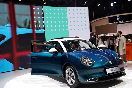 图为9月6日,亮相慕尼黑车展的中国长城汽车的“欧拉”新能源车型。(图片来源:中新社)