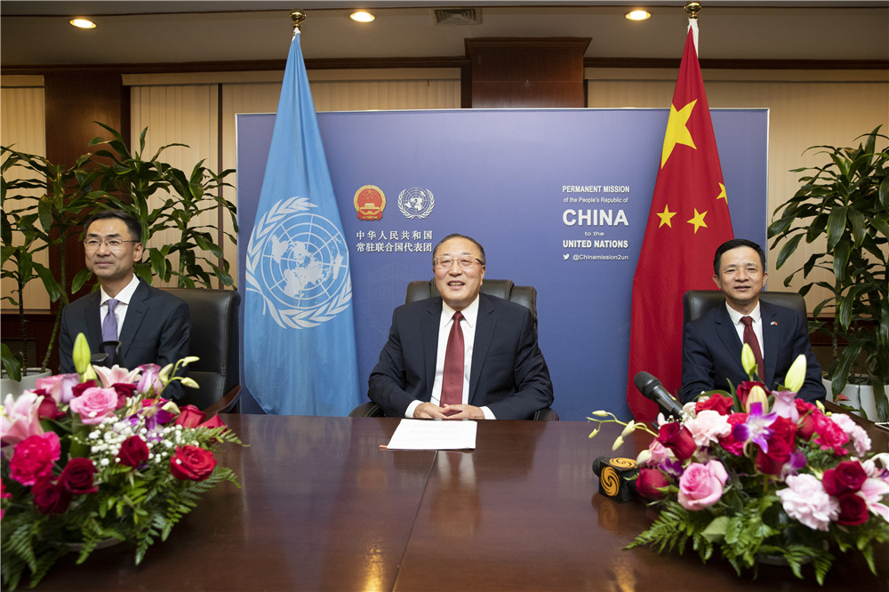 9月27日,中国常驻联合国代表团举办线上活动,庆祝中华人民共和国成立72周年暨恢复联合国合法席位50周年。中国常驻联合国代表张军(中)大使,常驻联合国副代表戴兵(右)大使、耿爽大使出席。(图片来源:中新社)