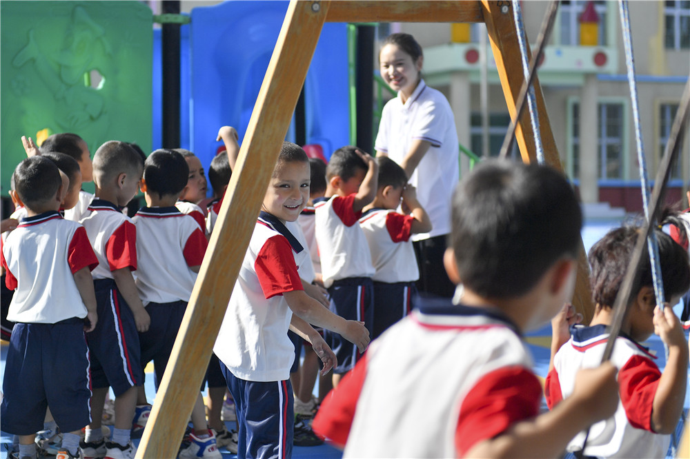 9月27日,新疆和田县布扎克乡库木村幼儿园,小朋友在嬉戏玩耍。(图片来源:中新社)