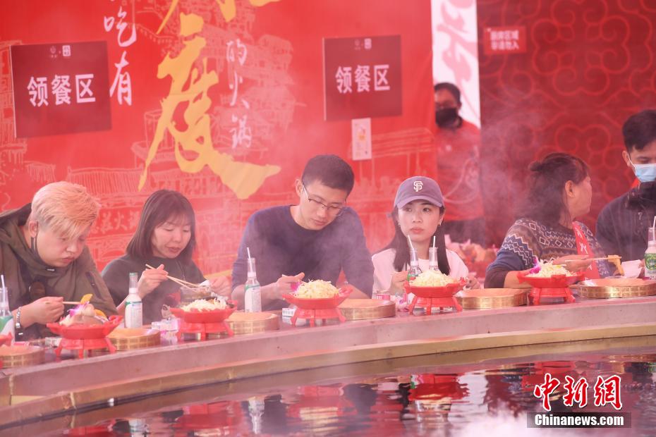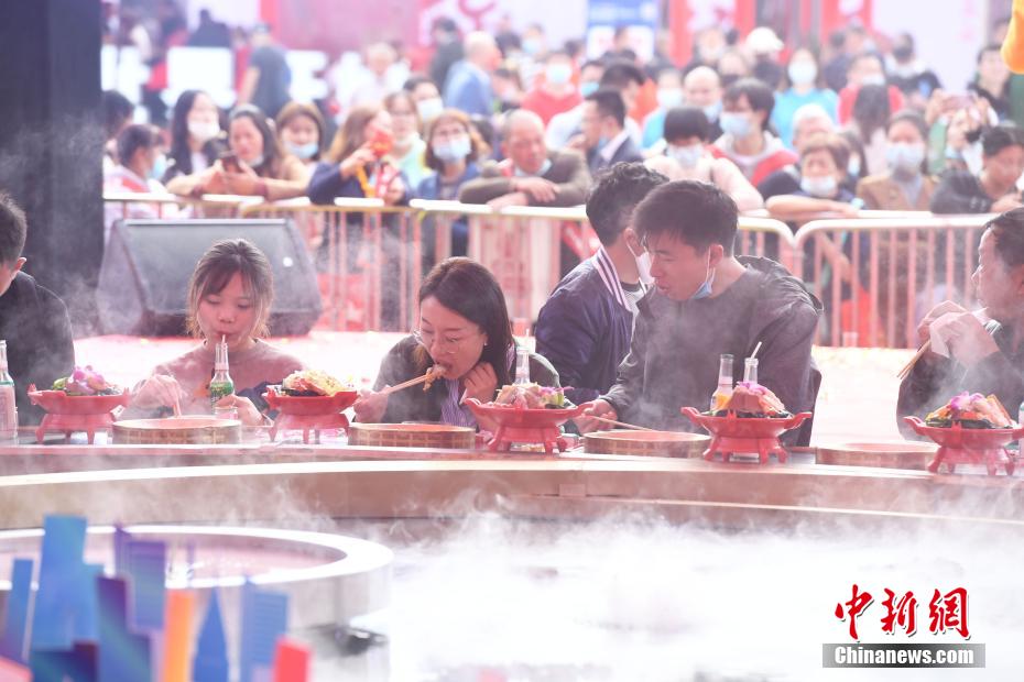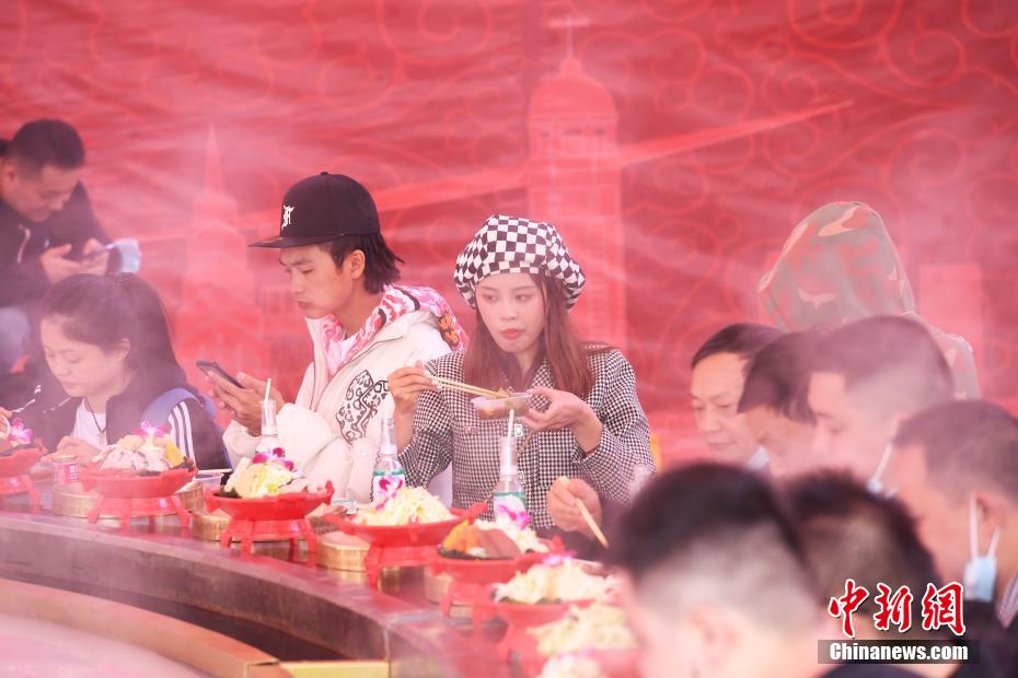 10月29日,56位市民在现场一同开涮巨型火锅。