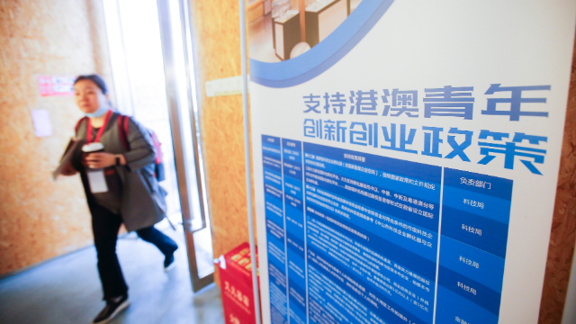 中山粤港澳青年创新创业合作平台内展示支持港澳青年创新创业的政策。(图片来源:中新社)