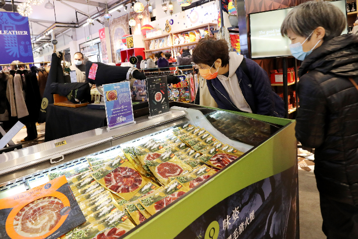 11月8日,两位顾客在进博集市内一个存放西班牙火腿的冰柜前驻足观看。(图片来源:本文图片均据新华社)