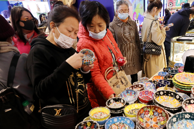 顾客们在进博集市内的土耳其商品摊位前驻足选购。