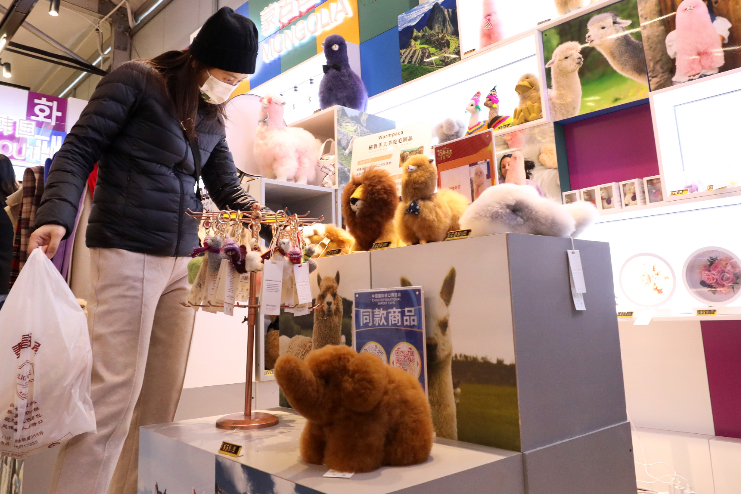 顾客在进博集市内抚摸由秘鲁羊驼毛制作的玩偶。